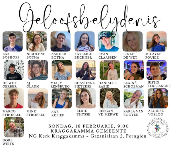 Wie is ons? 7 Jackie van Heerden & Tania Crous 8 Belydenisklas van 2024 9 Christoff van der Merwe 10 Dirk Kotze & Petro Vlok 11 Toit Wessels & Erika Marais |